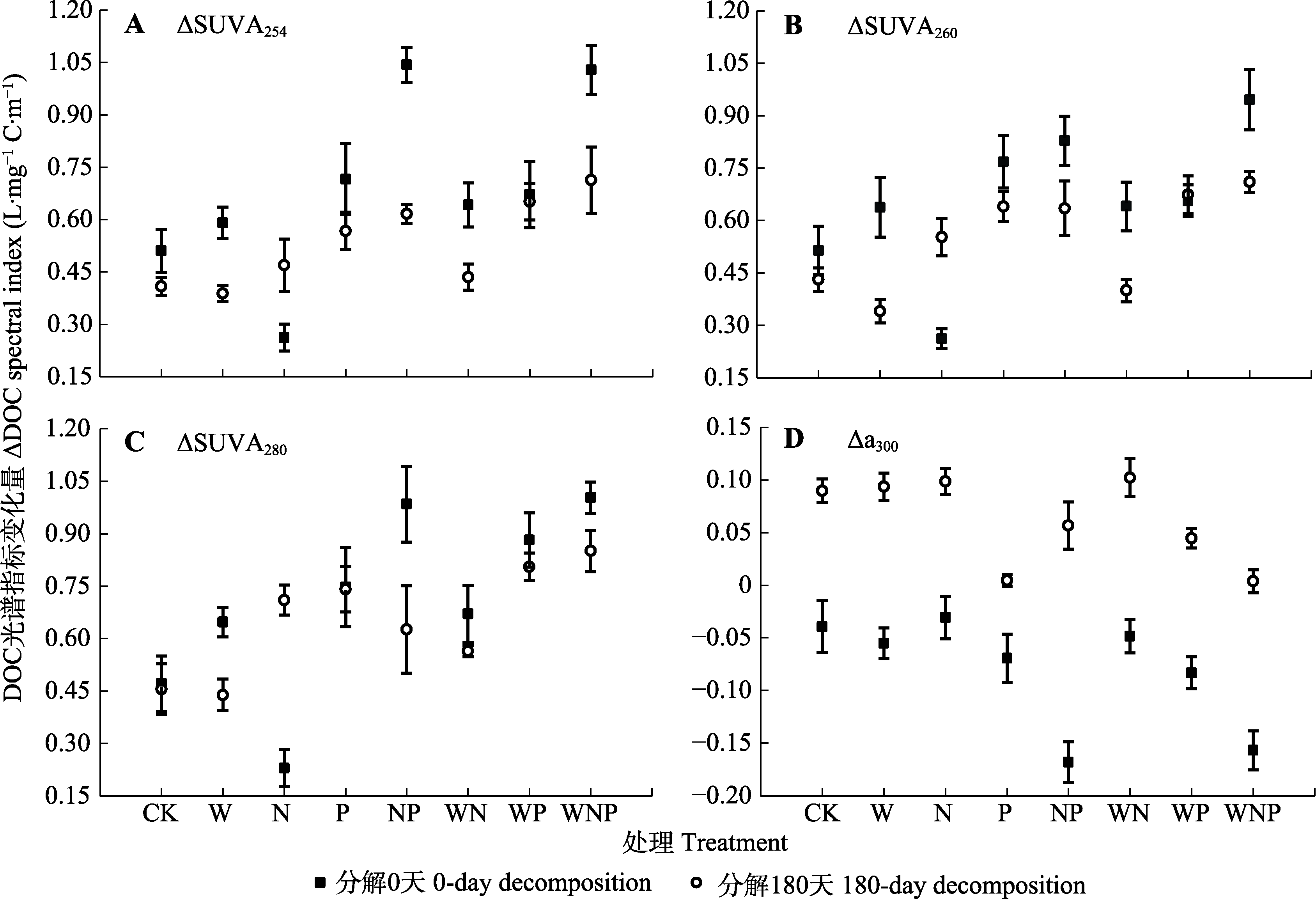 | Fig. 3 Effects of warming and nitrogen and phosphorus addition on the variations in dissolved organic carbon (ΔDOC) spectral index of litter with 0-day decomposition and 180-day decomposition in a subtropical forest (mean ± SE). ΔSUVA254, ΔSUVA260, ΔSUVA280 and Δa300 represented the aromaticity, hydrophobicity, high molecular weight and chromophoric dissolved oganic matter composition of leaf litter, respectively after 28-day incubation. CK, control treatment; N, nitrogen addition; NP, interaction between nitrogen and phosphorus addition; P, phosphorus addition; W, warming; WN, interaction between warming and nitrogen addition; WNP, interactions among warming, nitrogen and phosphorus addition; WP, interaction between warming and phosphorus addition. |