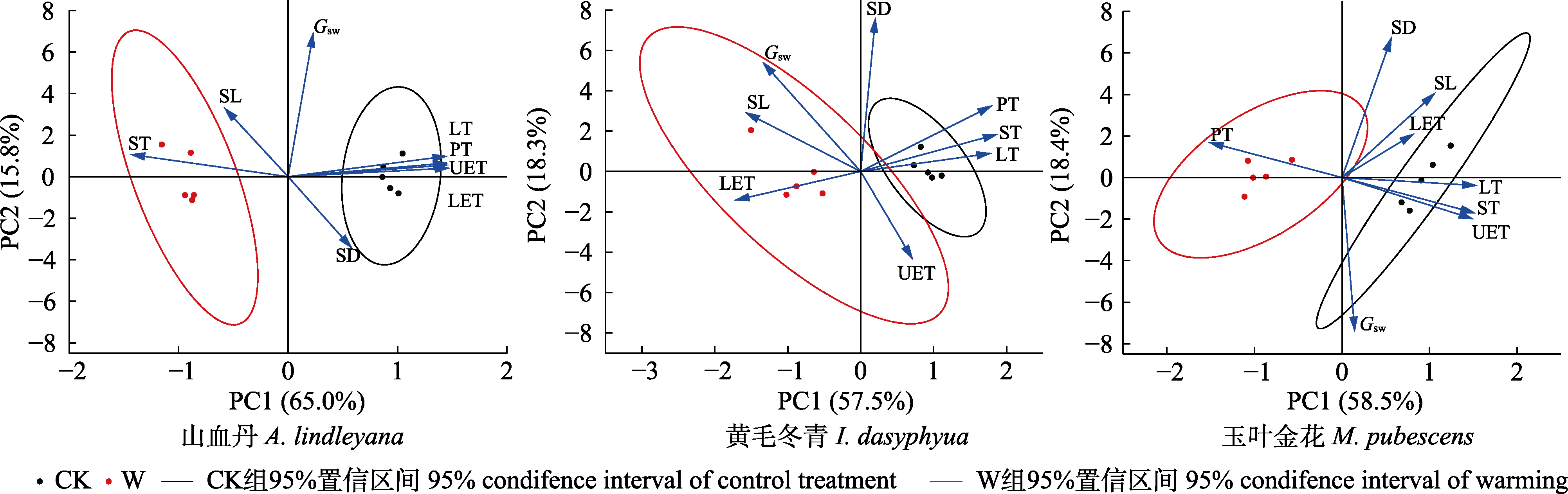 | 图5 山血丹、黄毛冬青和玉叶金花气孔及解剖性状主成分(PC)分析(每个点代表一个样方)。CK, 对照; Gsw, 气孔导度; LET, 下表皮厚度; LT, 叶片厚度; PT, 栅栏组织厚度; SD, 气孔密度; SL, 气孔长度; ST, 海绵组织厚度; UET, 上表皮厚度; W, 增温。 |