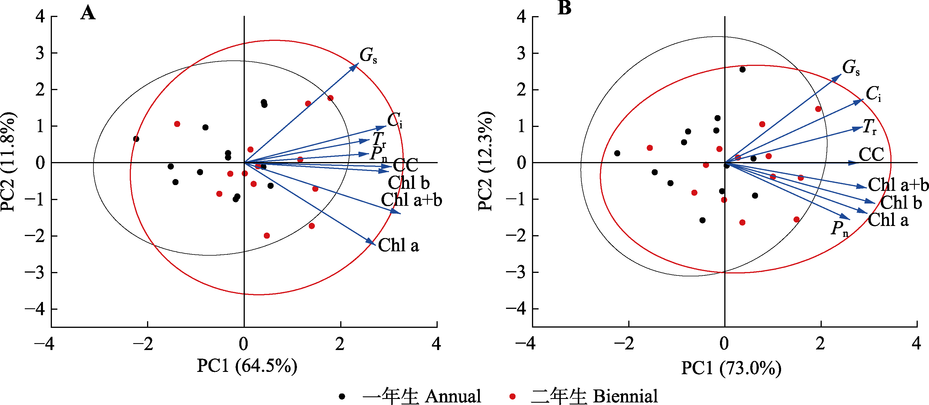 | 图9 生长调节剂对低温胁迫及复温下红海榄幼苗光合特性的主成分(PC)分析。A, 低温胁迫时期。B, 复温时期。CC, 类胡萝卜含量; Chl a, 叶绿素a含量; Chl a+b, 总叶绿素含量; Chl b, 叶绿素b含量; Ci, 胞间CO2浓度; Gs, 气孔导度; Pn, 净光合速率; Tr, 蒸腾速率。 |