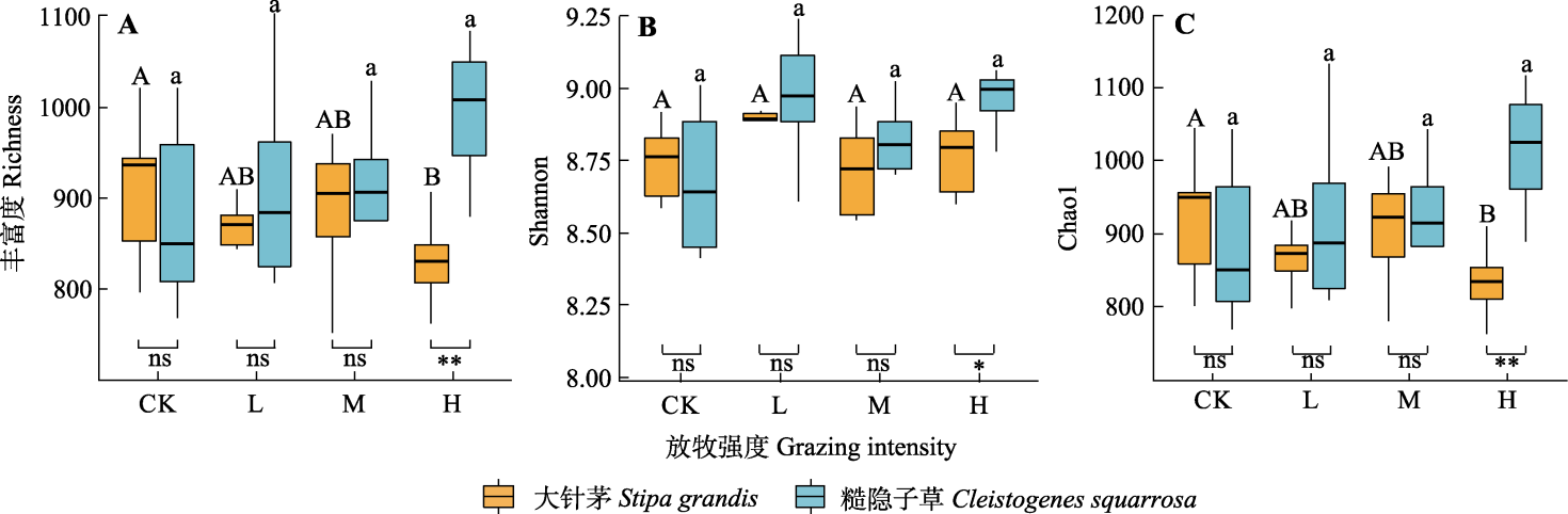| 图2 不同放牧强度下大针茅和糙隐子草根际细菌α多样性指数。*, p < 0.05; **, p < 0.01; ns, p ≥ 0.05。CK、L、M和H分别代表对照、轻度放牧、中度放牧、重度放牧。不同大写和小写字母分别表示不同放牧强度对大针茅和糙隐子草根际细菌α多样性影响差异显著(p < 0.05)。 |