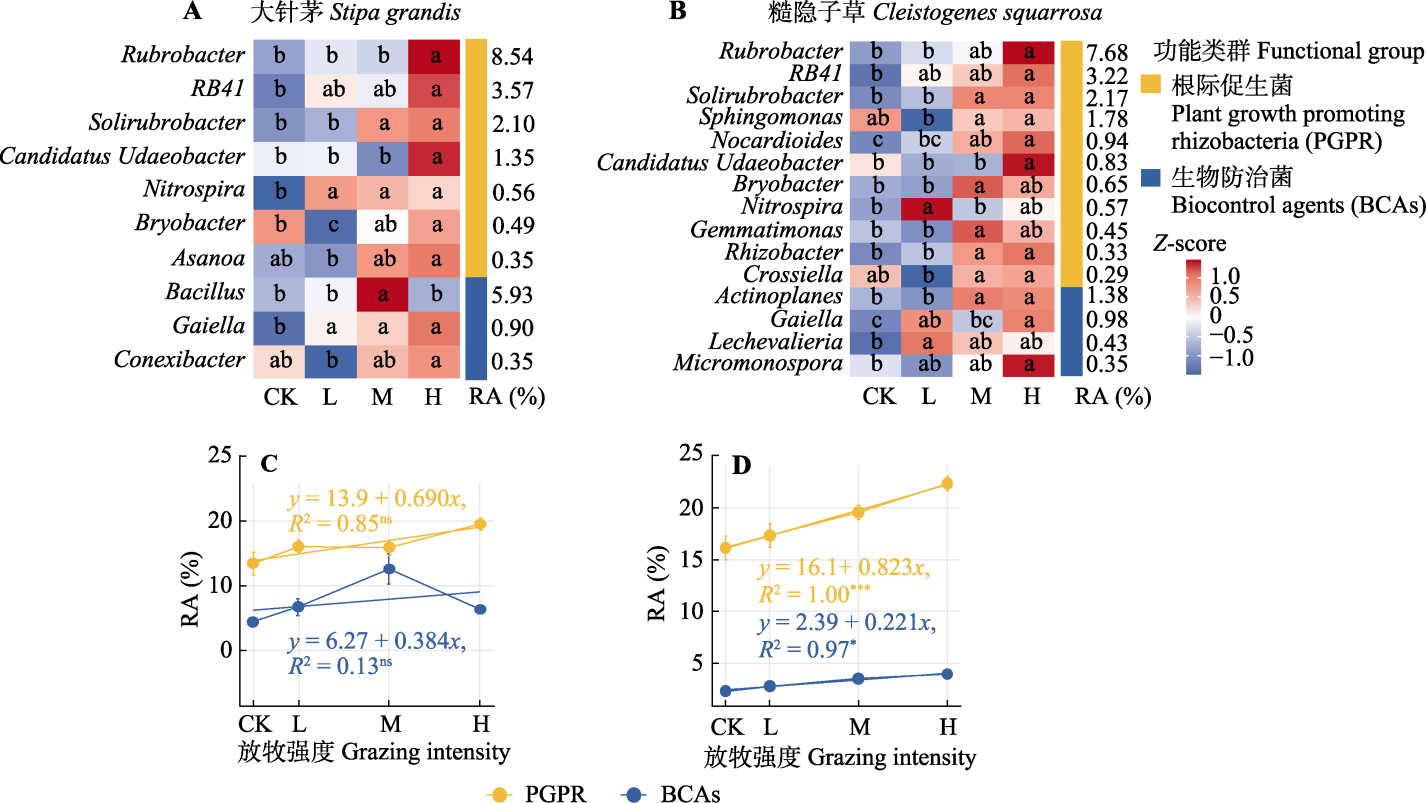 | Fig. 3 Heatmaps of rhizobacterial genera with increased relative abundance (A, B) and linear regression of functional group relative abundance (C, D) for Stipa grandis and Cleistogenes squarrosa under different grazing intensities. Different lowercase letters indicate significant differences (p < 0.05) in the relative abundance of genera influenced by varying grazing intensities in A and B. CK, L, M, and H represent control, light grazing, moderate grazing, and heavy grazing, respectively. RA denotes the average relative abundance of the genus under the four grazing intensities. Error bars in C and D represent mean ± SE. *, p < 0.05; ***, p < 0.001; ns, p ≥ 0.05. |